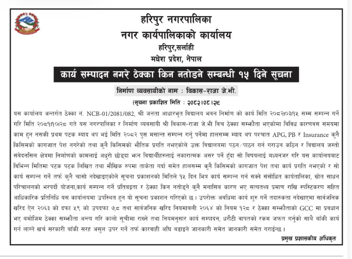 कार्य सम्पादन नगरे ठेक्का किन नतोड्ने सम्बन्धि सूचना ‍। #haripurmun #Notice