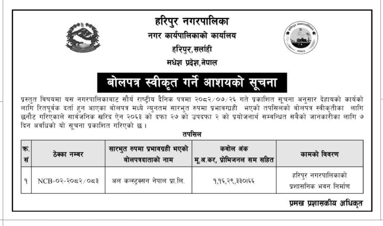 बोलपत्र स्वीकृत गर्ने आशयको सूचना । #haripurmun #Notice