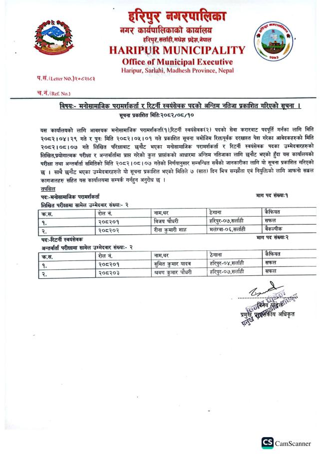 मनोसामाजिक परामर्शकर्ता र रिटर्नी स्वयमसेवक पदको अन्तिम नतिजा प्रकाशित गरिएको सम्बन्धमा । #haripurmun #Notice