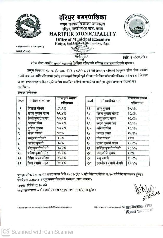 लोकसेवा आयोग तयारी कक्षाको लिखित परीक्षाको नतिजा प्रकाशन गरिएको सूचना ।