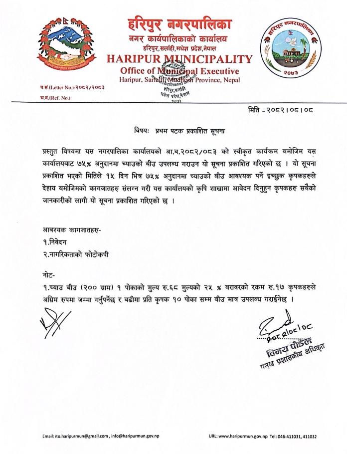 ७५% अनुदानमा च्याउको बिउ उपलब्ध गराउने सम्बन्धि सूचना । #Notice #haripurmun #developingharipur #agriculture