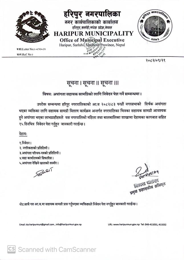 अपांगता सहायक सामाग्रीको लागि निवेदन पेश गर्ने सम्बन्धमा । #haripurmun #Notice