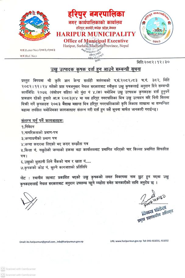उखु उत्पादक कृषक दर्ता हुन आउने सम्बन्धि सूचना । #haripurmun #Notice