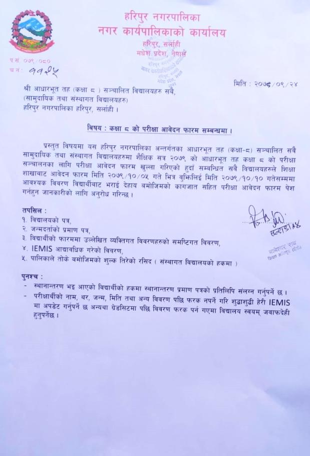 कक्षा ८ को परीक्षा आवेदन फारम सम्बन्धमा ।