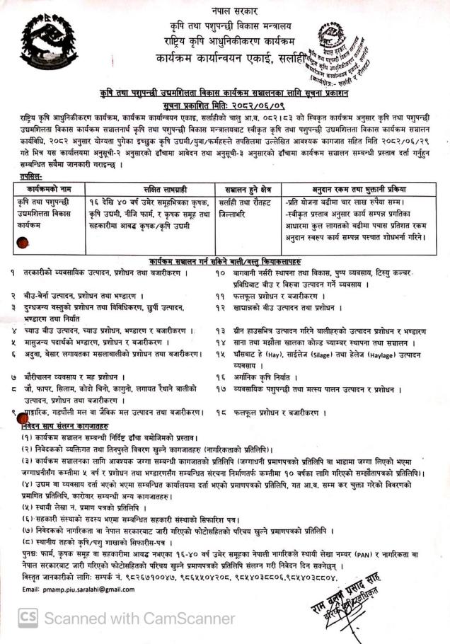 कृषि तथा पशुपन्छी उधमशिलता विकास कार्यक्रम संचालनका लागि सूचना प्रकाशन सम्बन्धि सूचना ।