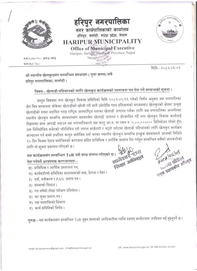 खेलाडी पहिचानको लागि खेलकुद कार्यक्रमको प्रस्तावना पत्र पेश गर्ने सम्बन्धको सूचना । #Notice #haripurmun