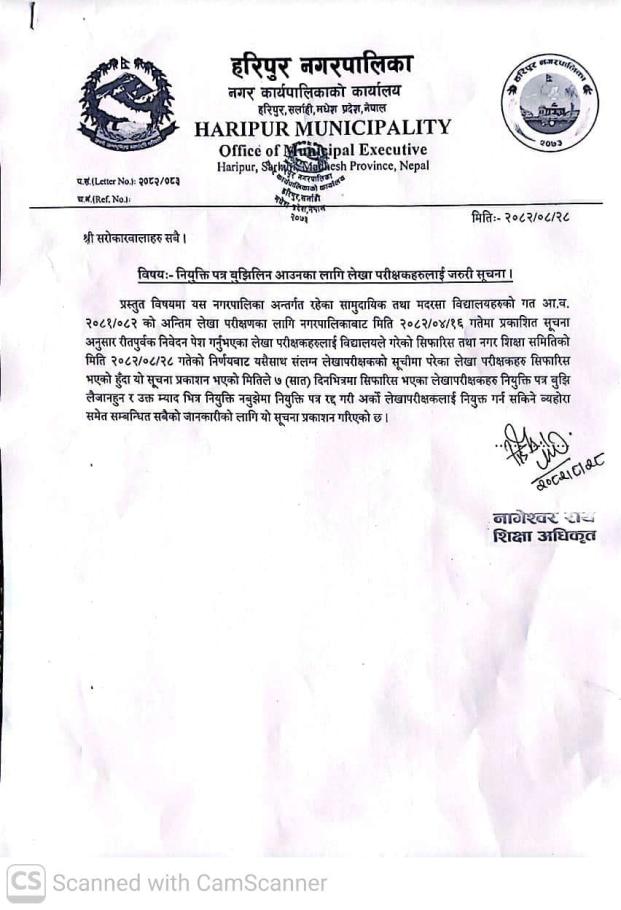 नियुक्ति पत्र बुझिलिन आउनका लागि लेखा परीक्षकहरुलाई जरूरी सूचना । #haripurmun #Notice