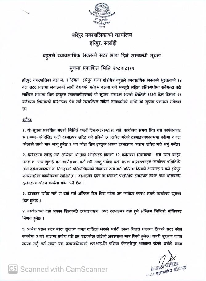 बहुतले व्यवसायिक भवनको सटर भाडा दिने सम्बन्धि सूचना । #haripurmun #Notice