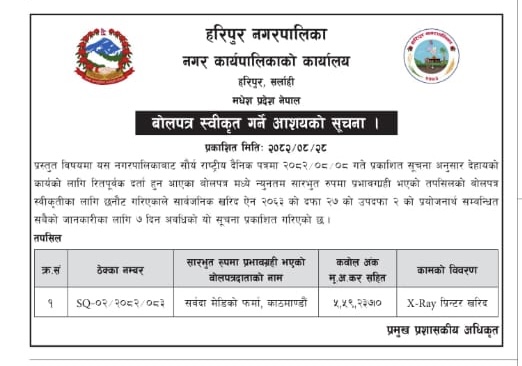 बोलपत्र स्वीकृत गर्ने आशयको सूचना । #haripurmun #Notice