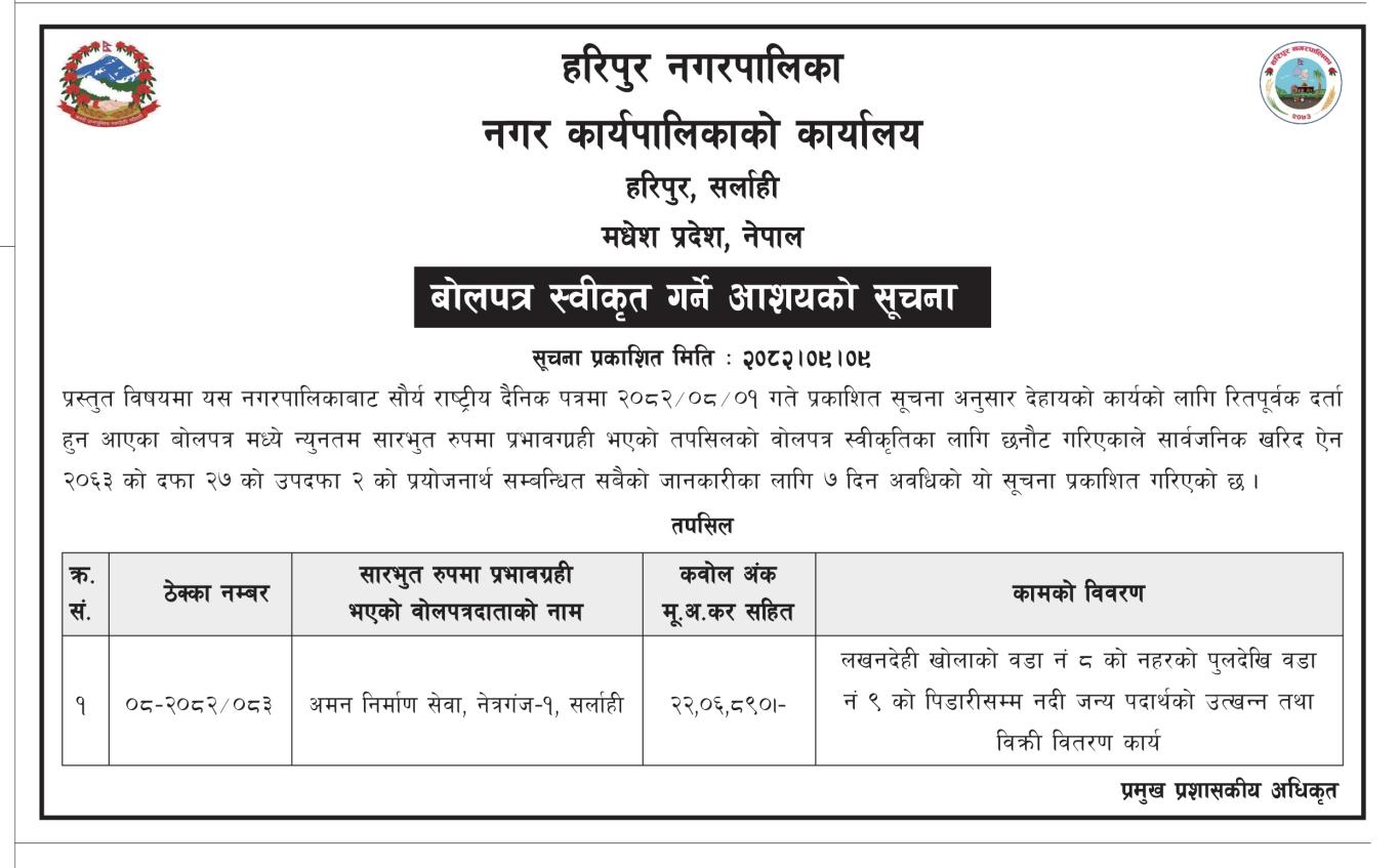 बोलपत्र स्वीकृत गर्ने आशयको सूचना । #haripurmun #Notice