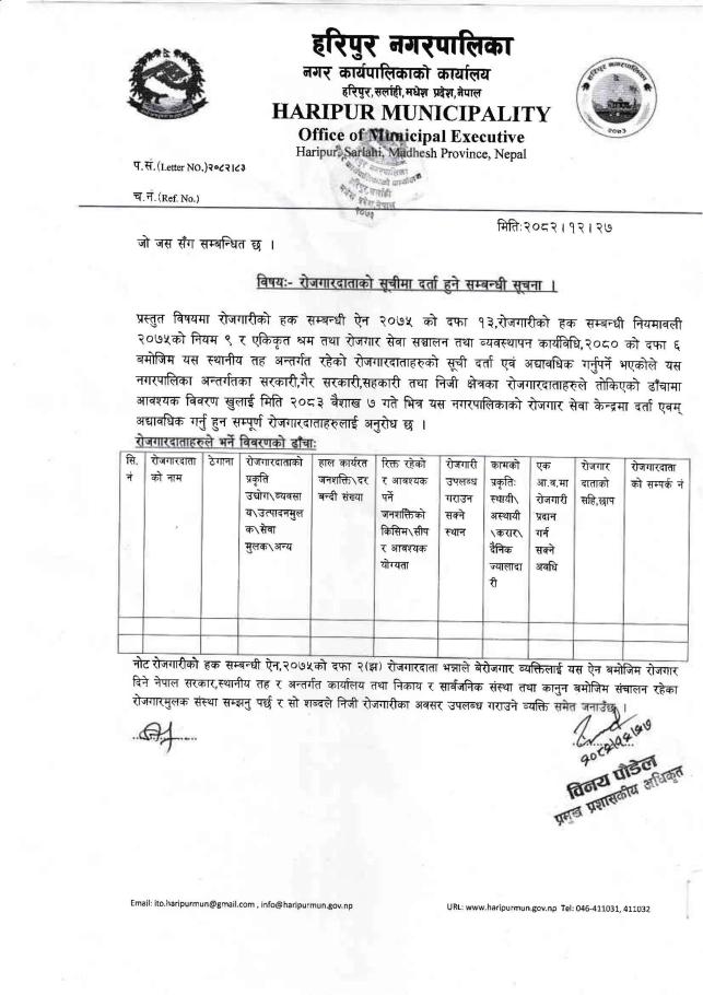 रोजगारदाताको सूचीमा दर्ता हुने सम्बन्धि सूचना । #haripurmun #Notice